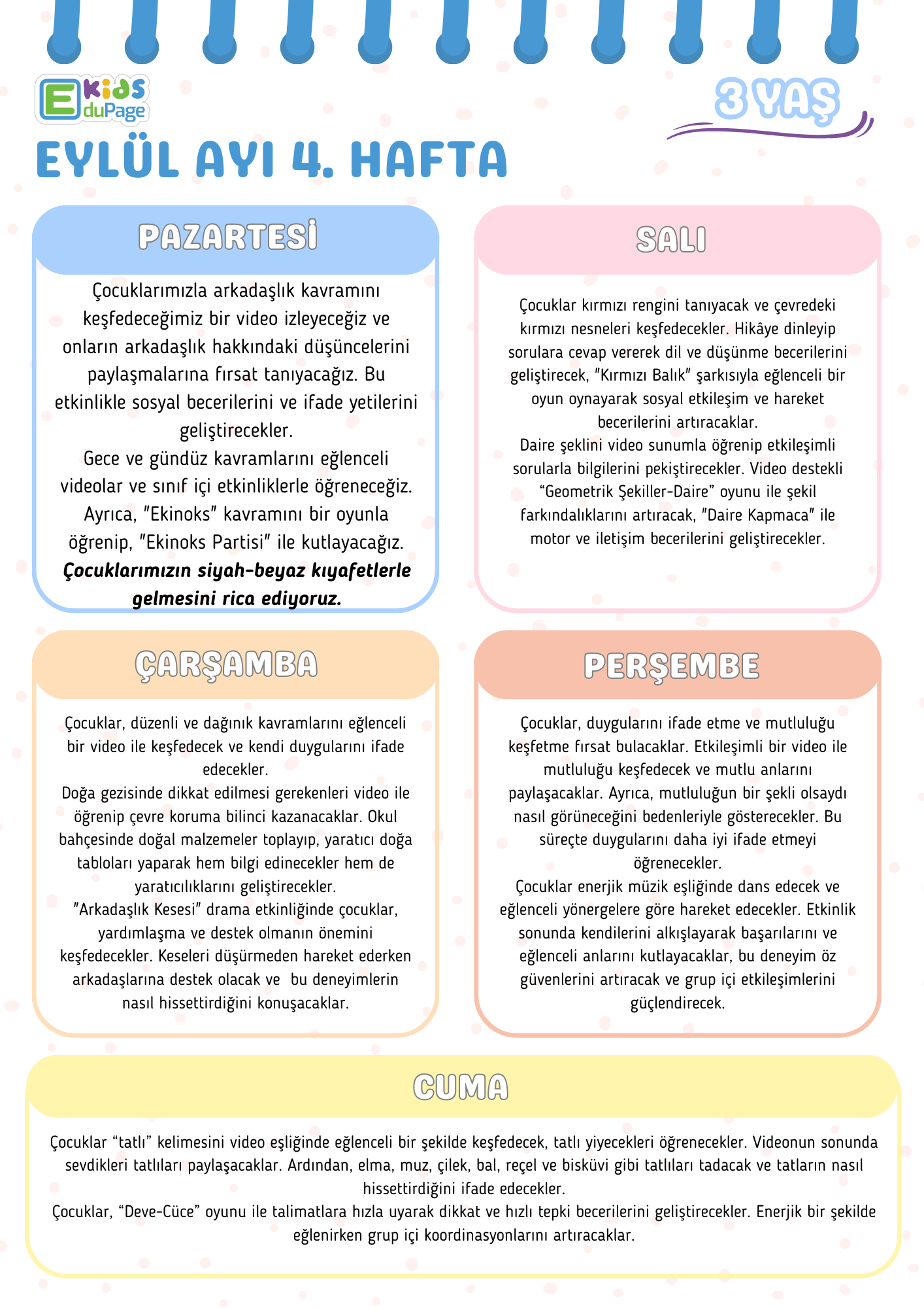 Planda Çarşamba günü verilen Doğayı Keşfediyorum konusu için hazırlanmış performans ve araştırma kartları bulunmaktadır. Ancak hafta içi bu çalışmaların yapılması aileler için zor olabileceğinden bu tarz çalışmaların hepsi her haftanın son okul günü olan Cuma günü gönderilir. Öğretmenler uygun gördükleri çalışmaları seçerek gönderebilirler. Aile ve çocuklarımıza verimli, eğlenceli bir hafta sonu dileriz.