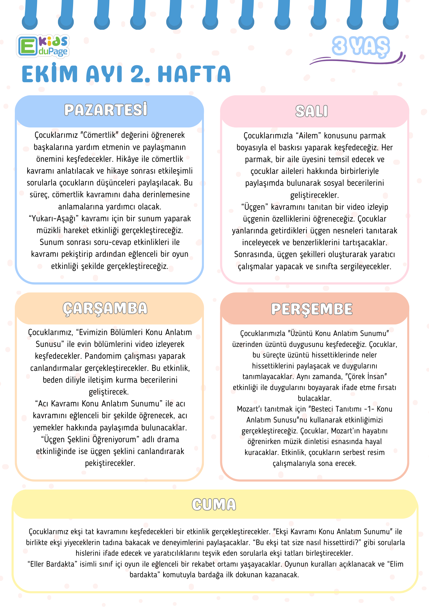 Aileler, çocuklarıyla birlikte oyun hamurundan pizza yapabilirler. Oyun hamurlarını kullanarak bir pizza yapmalarını ve ardından bıçak veya kesici ruletle çocuklarından pizzayı üçgen dilimlere ayırmalarını isteyebilirler. Daha sonra çocuklarına pizzanın toplam kaç dilim olduğunu, nasıl yaptıklarını ve dilimlerin hangi şekle benzediğini sorarak üçgen kavramına vurgu yapabilirler. Not: Kullanılan bıçak keskin ve ucu sivri olmamalı, kesici rulet ise oyun hamuru için üretilen oyuncak plastik rulet olmalıdır. Bu etkinlik, çocukların şekil ve sayı kavramlarını öğrenmelerine yardımcı olurken, aynı zamanda motor becerilerini geliştirir.