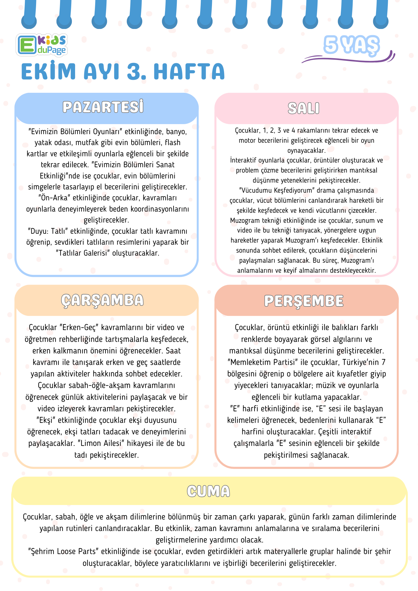 Okul öncesi yaş gruplarına özel, haftalık / aylık planlar ile tamamen uyumlu İngilizce ve Türkçe ders içeriklerinin tamamını sizlere sunuyoruz. Artık derslerinizde yapacağınız etkinlikleri düşünmenize gerek yok! Okul öncesinde 10 yılı aşkın deneyime sahip eğitimci kadromuz ile, ders içeriklerimiz profesyonelce hazırlandı. Ders içeriklerimiz değişen şartlara göre kısa sürede güncellenebilir.