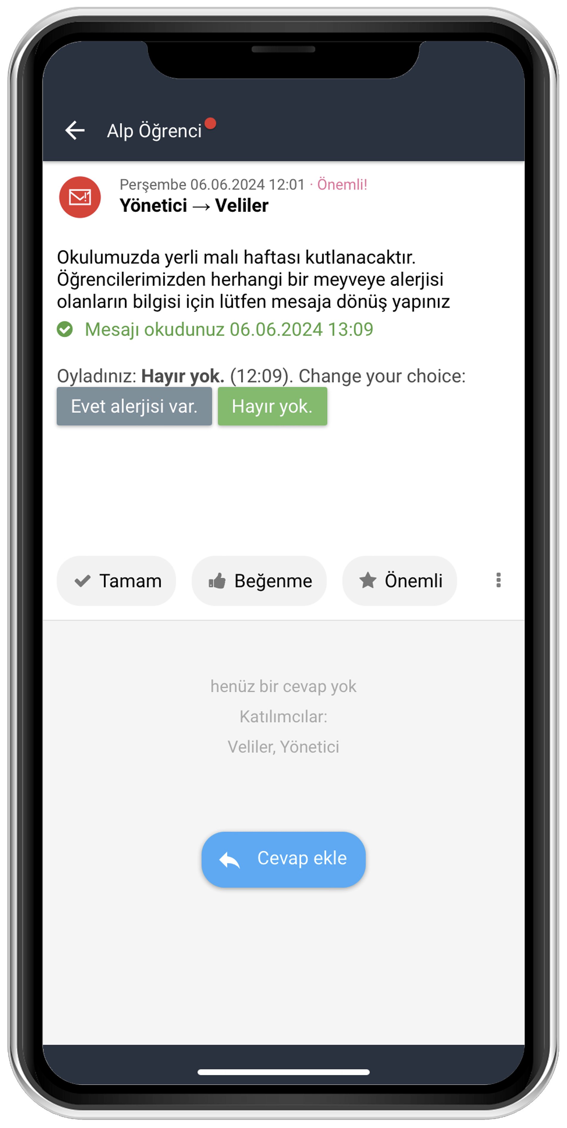 Velileriniz ile profesyonel mobil uygulamanız üzerinden mesajlaşmanızı, önemli mesajlarınız için, okundu bilgisi alabileceğiniz mesaj gönderebilmenizi sağlıyoruz.